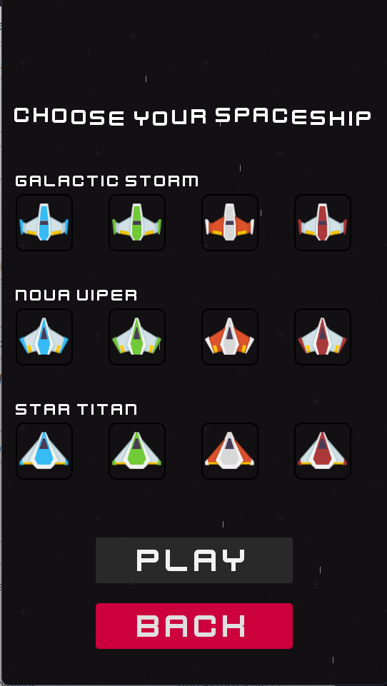 - Three Unique Spaceships: Choose from the Nova Viper, Star Titan, and Void Phantom, each with 4 color variants.